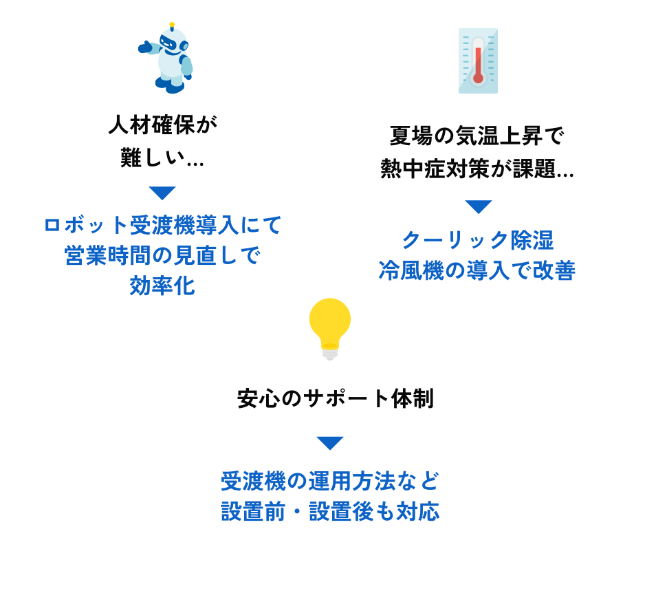 実際にクーリック除湿冷風機を設置している工場へご案内し、見学・体験していただくことも可能です!その後、御社の現地調査からスタートさせていただきます。